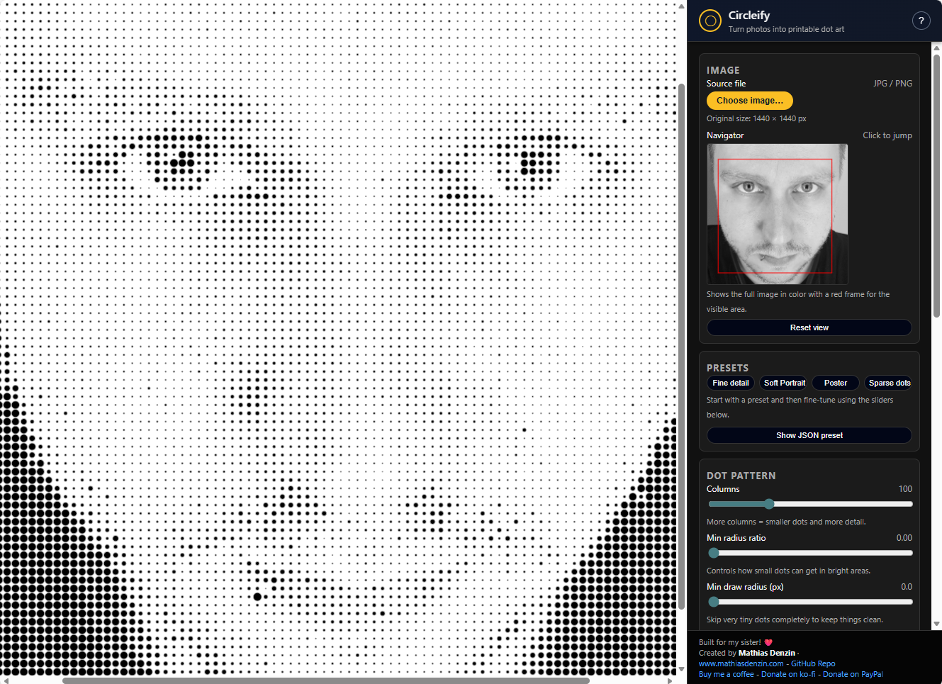 This is where the magic happens. Circleify exposes the main knobs of the dot grid so you can turn a noisy photo into a clean, printable poster: